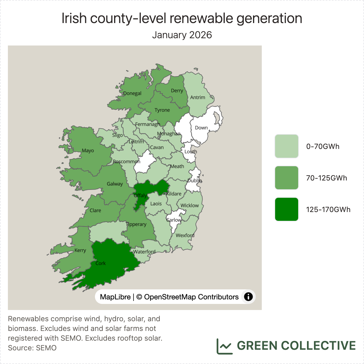 - County-level analysis: Offaly was the #1 renewable-producing county for the first time. This is the first time the top spot hasn't been occupied by either Cork or Kerry.