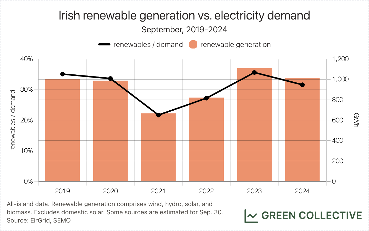 Generation from renewable sources during September 2024 was equivalent to 31.6% of all-island electricity demand: