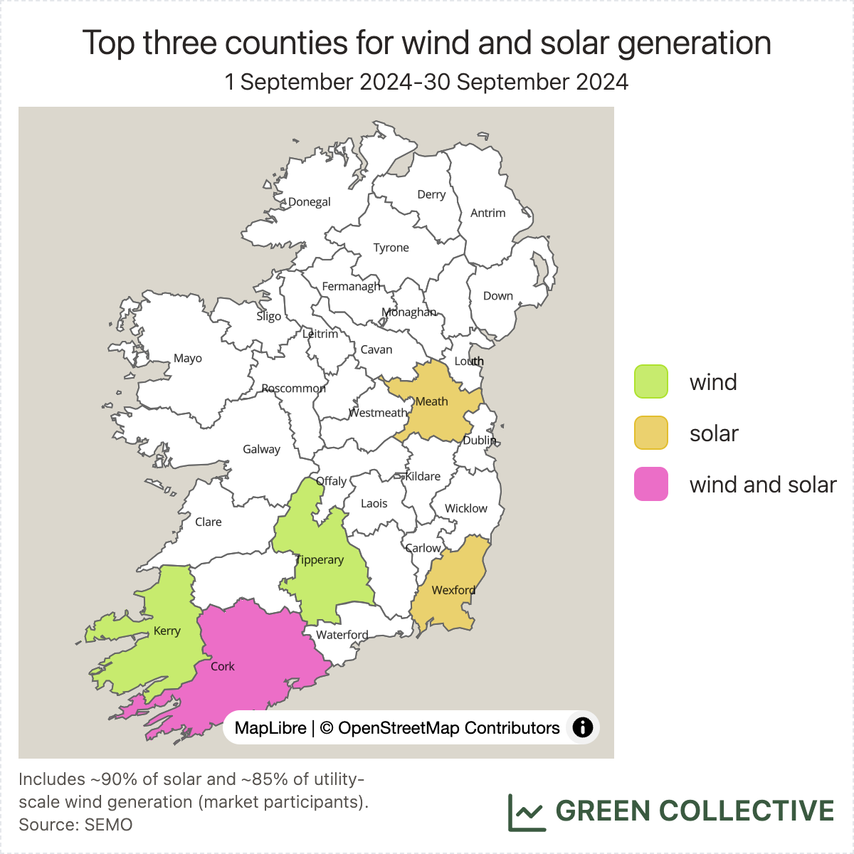 As in recent months, County Meath was home to approximately 50% of the month's solar generation with the next largest producer, County Wexford, well behind on approximately 22%.
