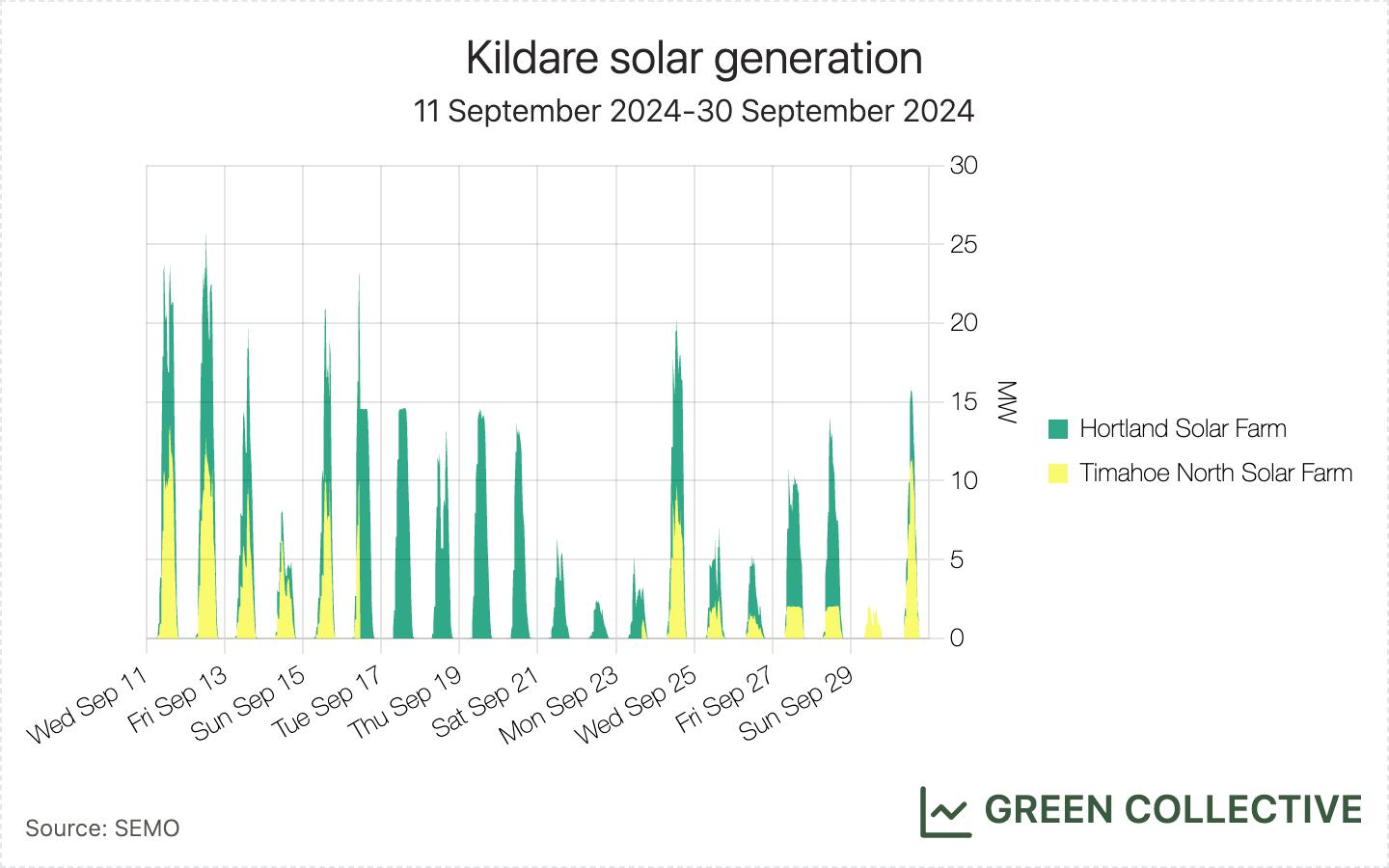 However, solar continues to perform strongly as we approach winter: peak monthly solar output this month was 603MW on September 19 which we will likely be able to revise to ~660MW once Eirgrid releases utility-scale data. This isn't so far from the current all-time high of 719MW, itself set in late August. Though the days will of course continue to grow shorter, this and the continued addition of new solar farms may yet help us see solar output records broken again before the end of the year. More on one such recent addition, Timahoe North in Kildare, below.