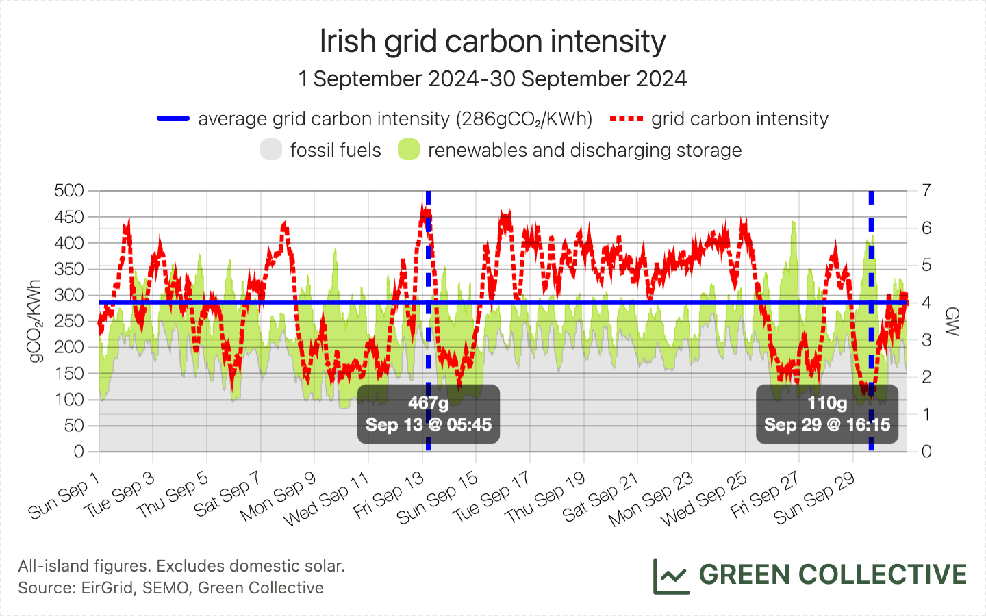 We estimate that for each kWh of electricity generated in September the Irish grid emitted between between 110g and 467g of CO2, for an average of 286gCO2/kWh.